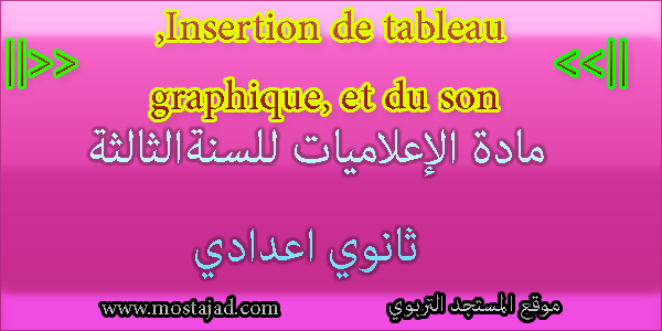 درس Insertion de tableau, graphique, et du son dans une diapositive درس في مادة المعلوميات Insertion de tableau, graphique, et du son dans une diapositive لتلاميذ السنة الثالثة من التعليم الثانوي الإعدادي. من إعداد: الأستاذة بشرى العلوي. الدرس ||>> فيديو توضيحي ||>> رابط للتحميل Downlaod درس Insertion de tableau, graphique, et du son dans une diapositive