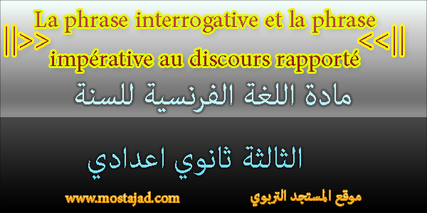 درس La phrase interrogative et la phrase impérative au discours rapporté درس في مادة اللغة الفرنسية La phrase interrogative et la phrase impérative au discours rapporté لتلاميذ السنة الثالثة من التعليم الثانوي الإعدادي. الدرس ||>> فيديو توضيحي ||>> رابط للتحميل Downlaod درس La phrase interrogative et la phrase impérative au discours rapporté