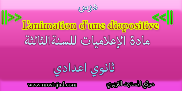 درس L’animation d’une diapositive – la transition entre les diapositives درس في مادة المعلوميات L’animation d’une diapositive – la transition entre les diapositives لتلاميذ السنة الثالثة من التعليم الثانوي الإعدادي. من إعداد: الأستاذة بشرى العلوي. الدرس ||>> فيديو توضيحي ||>> رابط للتحميل Downlaod درس L’animation d’une diapositive – la transition entre les diapositives