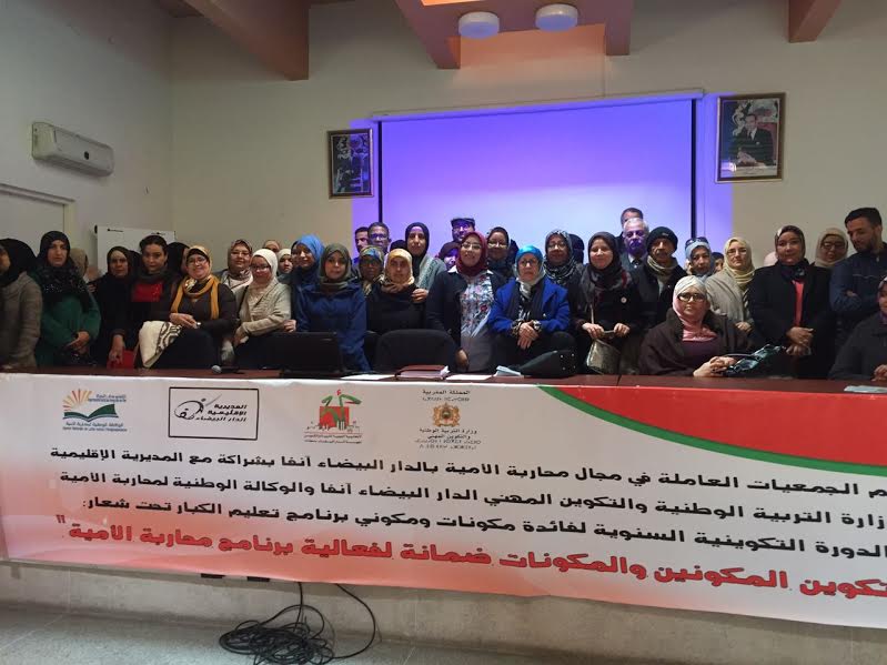 نظمت الجمعيات المنتدبة في مجال محو الأمية وما بعد محو الأمية بالدار البيضاء أنفا بشراكة مع المديرية الإقليمية لوزارة التربية الوطنية والتكوين المهني الدار البيضاء أنفا و الوكالة الوطنية لمحاربة الأمية الدورة التكوينية السنوية لفائدة مكونات ومكوني برنامج تعليم الكبار تحت شعار: “تكوين المكونين والمكونات ضمانة لفعالية برامج محاربة الأمية” وذلك أيام 23 /24 /25 مارس 2017 بملحقة غاندي للمركز الجهوي لمهن التربية والتكوين .