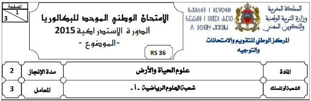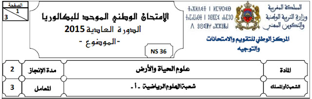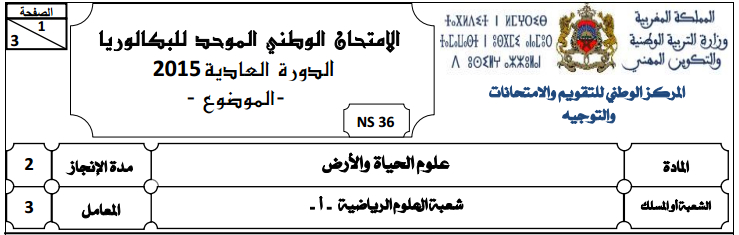 مواضيع الإمتحانات الوطنية لنيل شهادة الباكالوريا في مادة علوم الحياة و الأرض  مع التصحيح– نموذج 2015-الدورة العادية مسلك العلوم الرياضية أ.