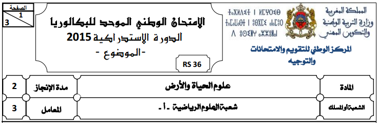 مواضيع الإمتحانات الوطنية لنيل شهادة الباكالوريا في مادة علوم الحياة و الأرض  مع التصحيح– نموذج 2015-الدورة الإستدراكية مسلك العلوم الرياضية أ.