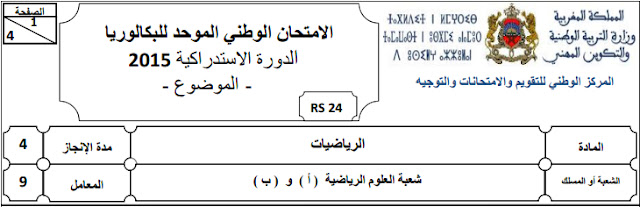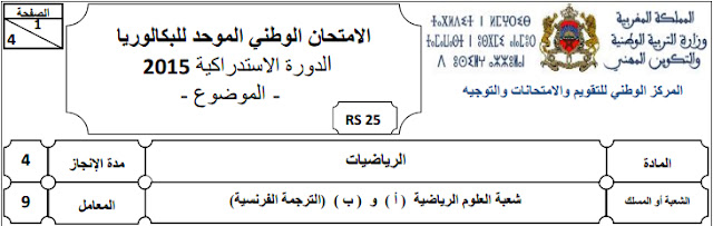 مواضيع الإمتحانات الوطنية لنيل شهادة الباكالوريا في مادة الرياضيات (الترجمة الفرنسية) مع التصحيح- نموذج 2015-الدورة الإستدراكية مسلك العلوم الرياضية أ و ب.