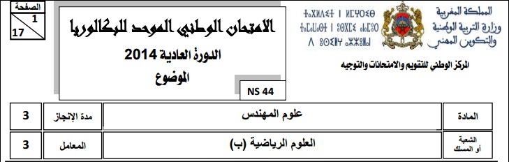 مواضيع الإمتحانات الوطنية لنيل شهادة الباكالوريا في مادة علوم المهندس مع التصحيح- نموذج 2015- الدورة الإستدراكية مسلك العلوم الرياضية ب.