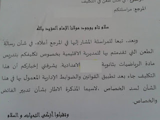 انا استاذ الثانوي الاعدادي مادة التكنولوجيا الصناعية انتقلت بموجب الحركة الوطنية الى اعدادية بتمارة ، مع بداية الموسم الدراسي لم اتوصل بجدول الحصص سالت المدير عن الامر قال بان عندهم تعليمات من المديرية الاقليمية استفسرته كتابيا رفض استلام الاستفسار ، بعدها توصلت بتكليف من المديرية الاقليمية رغم اني لست فائضا وبمادة غير تخصصي واعدادية اخرى استلمت التكليف وطعنت فيه واستلمت جدول الحصص وادخل التلاميذ كي لا احسب منقطع عن العمل لكن ارفض تدريس مادة لست متمكنا منها وليس لها اي سند قانوني او تربوي كما جاء في الطعن.