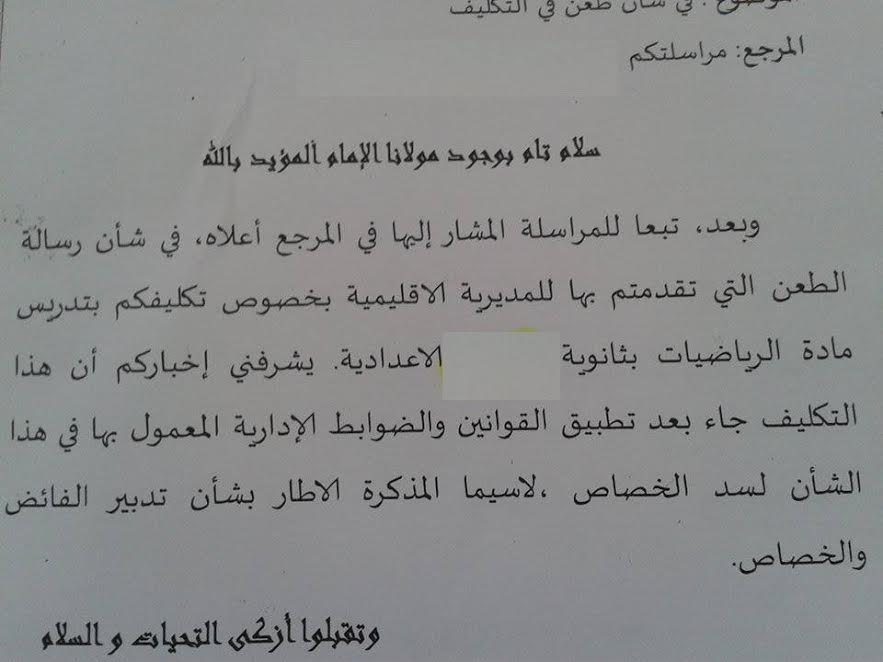 انا استاذ الثانوي الاعدادي مادة التكنولوجيا الصناعية انتقلت بموجب الحركة الوطنية الى اعدادية بتمارة ، مع بداية الموسم الدراسي لم اتوصل بجدول الحصص سالت المدير عن الامر قال بان عندهم تعليمات من المديرية الاقليمية استفسرته كتابيا رفض استلام الاستفسار ، بعدها توصلت بتكليف من المديرية الاقليمية رغم اني لست فائضا وبمادة غير تخصصي واعدادية اخرى استلمت التكليف وطعنت فيه واستلمت جدول الحصص وادخل التلاميذ كي لا احسب منقطع عن العمل لكن ارفض تدريس مادة لست متمكنا منها وليس لها اي سند قانوني او تربوي كما جاء في الطعن.