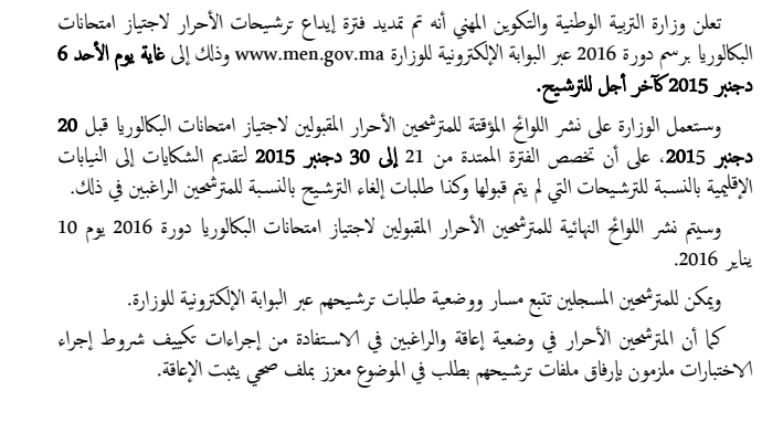 خبر يهم المترشحين لالأحرار لاجتياز امتحانات الباكالوريا موسم 2015 – 2016