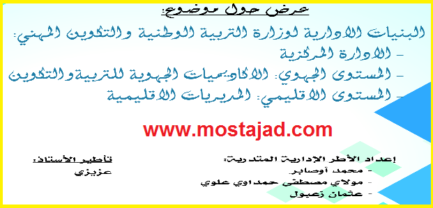 عرض حول حول البنيات الإدارية لوزارة التربية الوطنية في جميع المستويات PPT >> تجميعية مواضيع العروض التربوية ||>> التفاصيل: بالتوفيق للجميع لا تنسونا بصالح الدعاء رابط للتحميل Downlaod عرض حول حول البنيات الإدارية لوزارة التربية الوطنية في جميع المستويات PPT