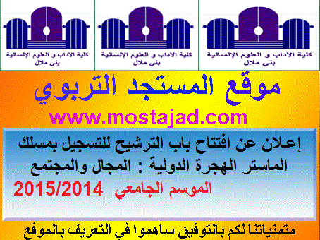 إعـلان عن افتتاح باب الترشيح للتسجيل بمسلك الماستر الهجرة الدولية : المجال والمجتمع برسم الموسم الجامعي 2015/2014 المرجو الضغط أسفله لمعرفة التفاصيل: هنا