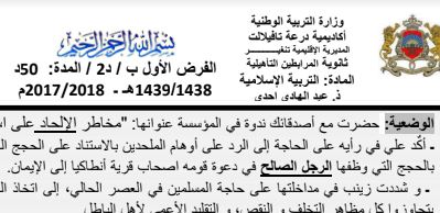 فرض محروس رقم 2 في مادة التربية الاسلامية مستوى السنة الثانية باكالوريا الدورة الأولى تجميعية فروض مادة التربية الاسلامية السنة الثانية باكالوريا علوم الحياة والارض Pour Télécharger لتحميل الملف