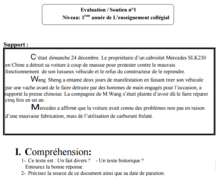 فروض الدورة الأولى مادة اللغة الفرنسية (النموذج 10) الأولى إعدادي