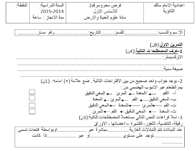 فروض الدورة الأولى مادة علوم الحياة والأرض (النموذج 6) الأولى إعدادي