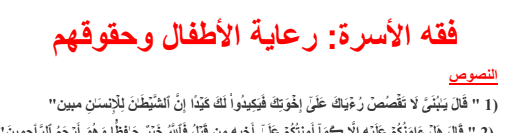 دروس مادة التربية الاسلامية الأولى باكالوريا شعبة العلوم الاقتصادية والتدبير فــقــــه الأســــرة: رعاية الأطفال وحقوقهم Pour Télécharger لتحميل الملف