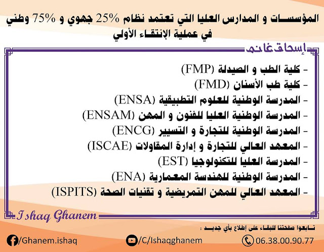 لأصحاب الباك : المؤسسات و المعاهد و المدارس العليا التي تعتمد على نظام 25% جهوي و 75% وطني في عملية الانتقام الأولي