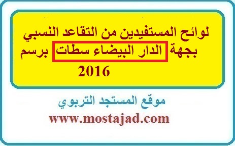 لوائح المستفيدين من التقاعد النسبي بجهة الدار البيضاء سطات برسم 2016 حظ موفق للجميع للتحميل المرجو الضغط على الرابط أسفله: هنا