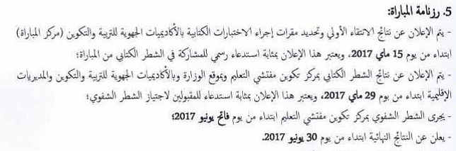 في الوقت الذي ينتظر فيه الآلاف من المترشحين الإفراج عن نتائج الشطر الكتابي لمباراة تكوين مفتشي التعليم التي كان اجتيازها بتاريخ 20-21 ماي 2017 في ست أكاديميات جهوية: وجدة – فاس- الرباط- الدار البيضاء- أكادير- مراكش. مازال الغموض يلف أسباب عدم الإعلان عن النتائج التي كان من المنتظر الإعلان عنها ابتداء من 29 ماي، بيْد أنَّ الوزارة الوصية لم تحترم المواعيد الواردة في المذكرة المنظمة للمباراة (17/046) الصادرة بتاريخ 30 مارس 2017، كما واضح في الرزنامة أسفله: