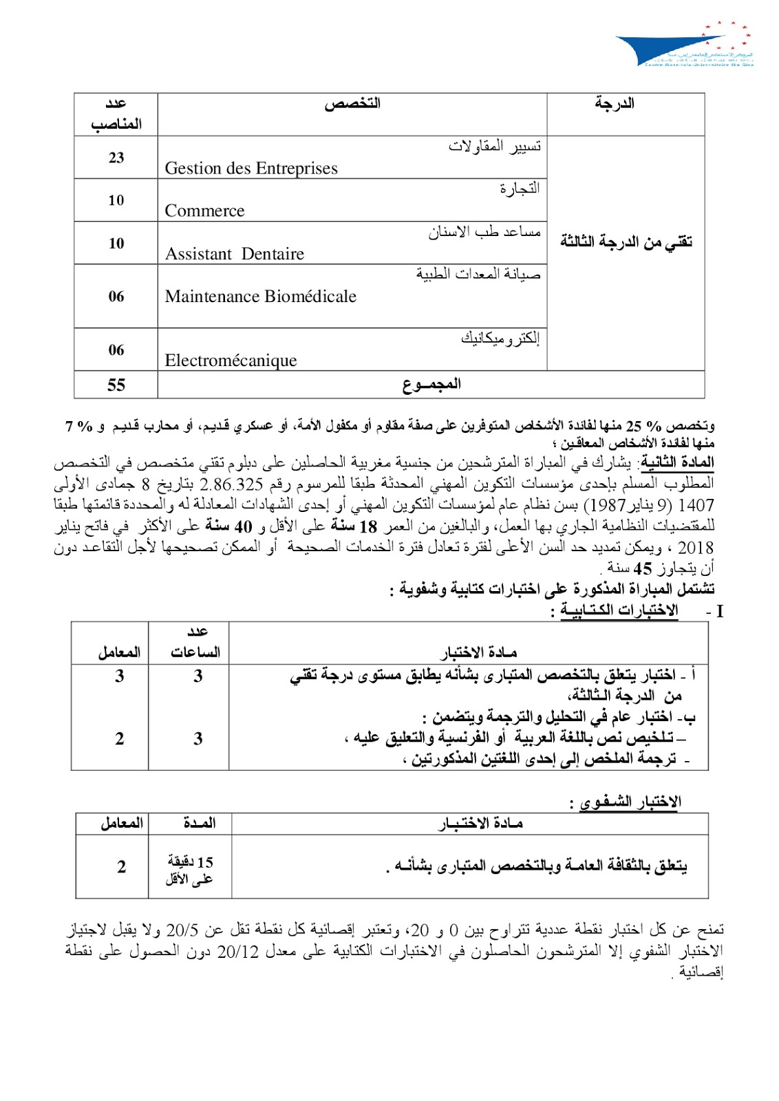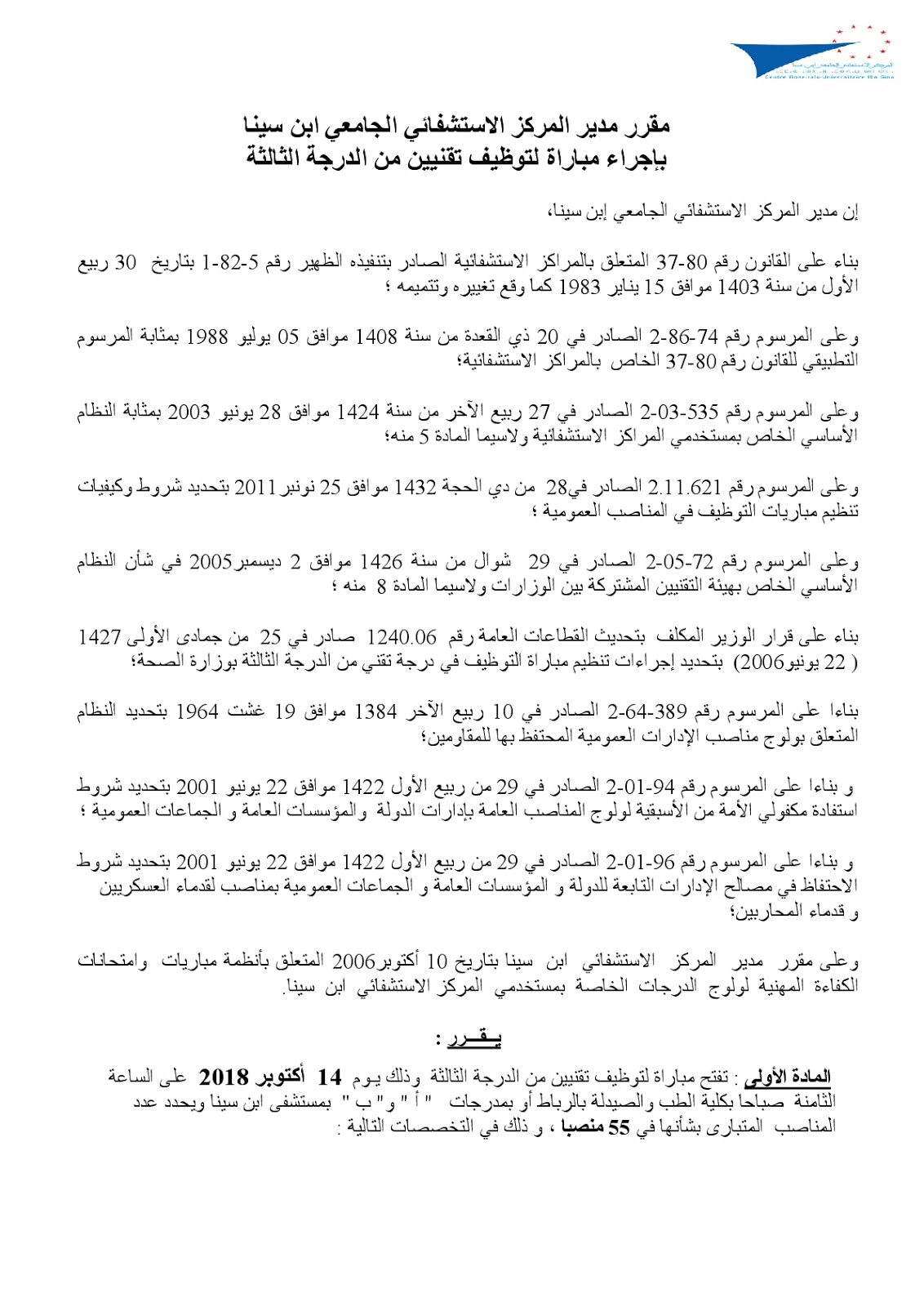 مدير المركز الاستشفائي ابن سينا يقرر اجراء مباراة 55 تقني من الدرجة الثالثة و آخر أجل هو 14 شتنبر 2018
