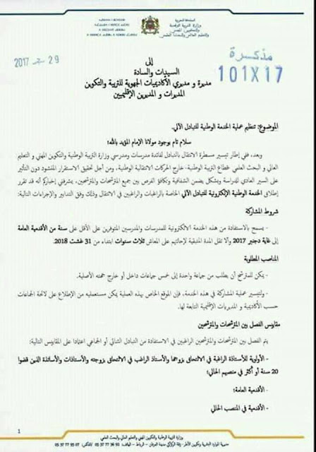 مذكرة وزارية منظمة لحركة الإنتقال بالتبادل الآلي 2017 بالتوفيق للجميع مذكرة وزارية منظمة للإنتقال لأسباب صحية 2017 المرجو الضغط من هنا