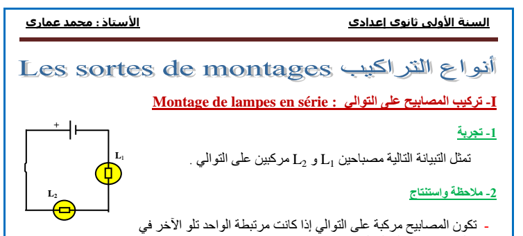 يتضمن درس أنواع التراكيب لتلاميذ السنة الأولى من التعليم الثانوي الإعدادي المحاور التالية:- تركيب المصابيح على التوالي.