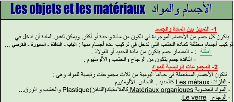 يتضمن درس الأجسام والمواد لتلاميذ السنة الثالثة من التعليم الثانوي الإعدادي المحاور التالية:- لتمييز بين المادة واالجسم.
