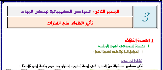 يتضمن درس تأثير الهواء على الفلزات لتلاميذ السنة الثالثة من التعليم الثانوي الإعدادي المحاور التالية: