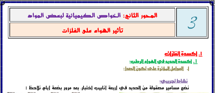 يتضمن درس تأثير الهواء على الفلزات لتلاميذ السنة الثالثة من التعليم الثانوي الإعدادي المحاور التالية: