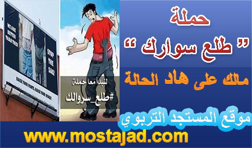 أطلق نشطاء مغاربة ، عبر موقع التواصل الاجتماعي ” الفيس بوك”، حملة حملت شعار” لنبدأ معا حملة طلع سروالك” التي أرفقوها بكاريكاتور ساخر ( الصورة). وتهدف هذه الحملة، التي تأتي أعقاب تنامي ظاهرة السروايل الكاشفة للعورات، بهدف حث الشباب على تخلي عن موضة “السراويل المتدلية”.
