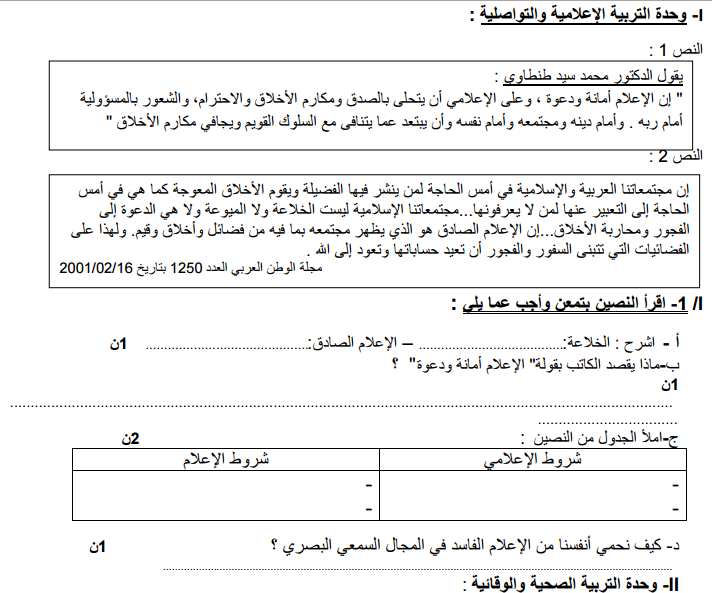 نماذج الفرض الأول الدورة الثانية التربية الإسلامية الثالثة إعدادي -نموذج4-