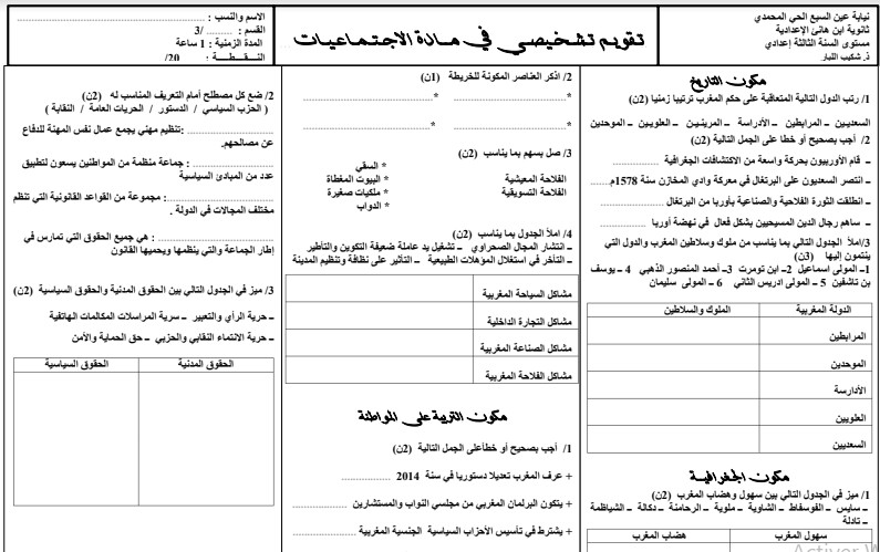 نماذج روائز التقويم التشخيصي الإجتماعيات الثالثة ثانوي إعدادي مع التصحيح