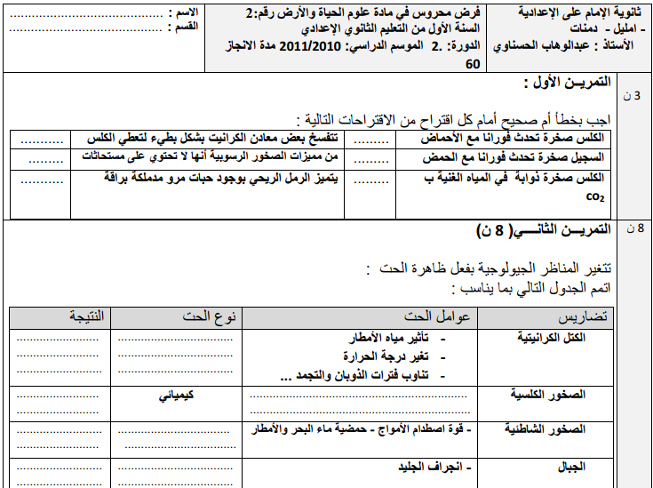 - نماذج فروض الدورة الثانية مادة علوم الحياة و الارض (النموذج 3) الأولى إعدادي – New!