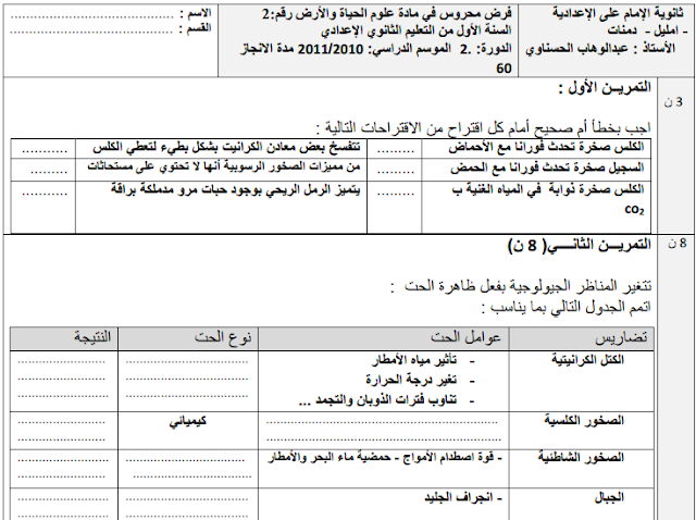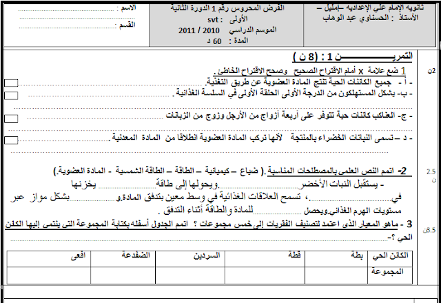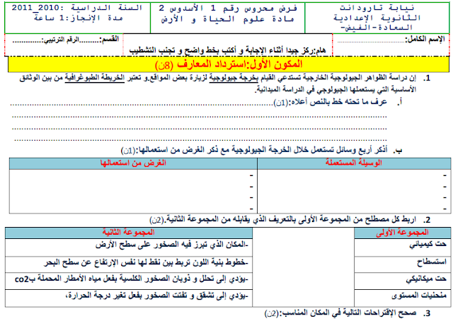 نماذج فروض الدورة الثانية مادة علوم الحياة و الارض الأولى إعدادي