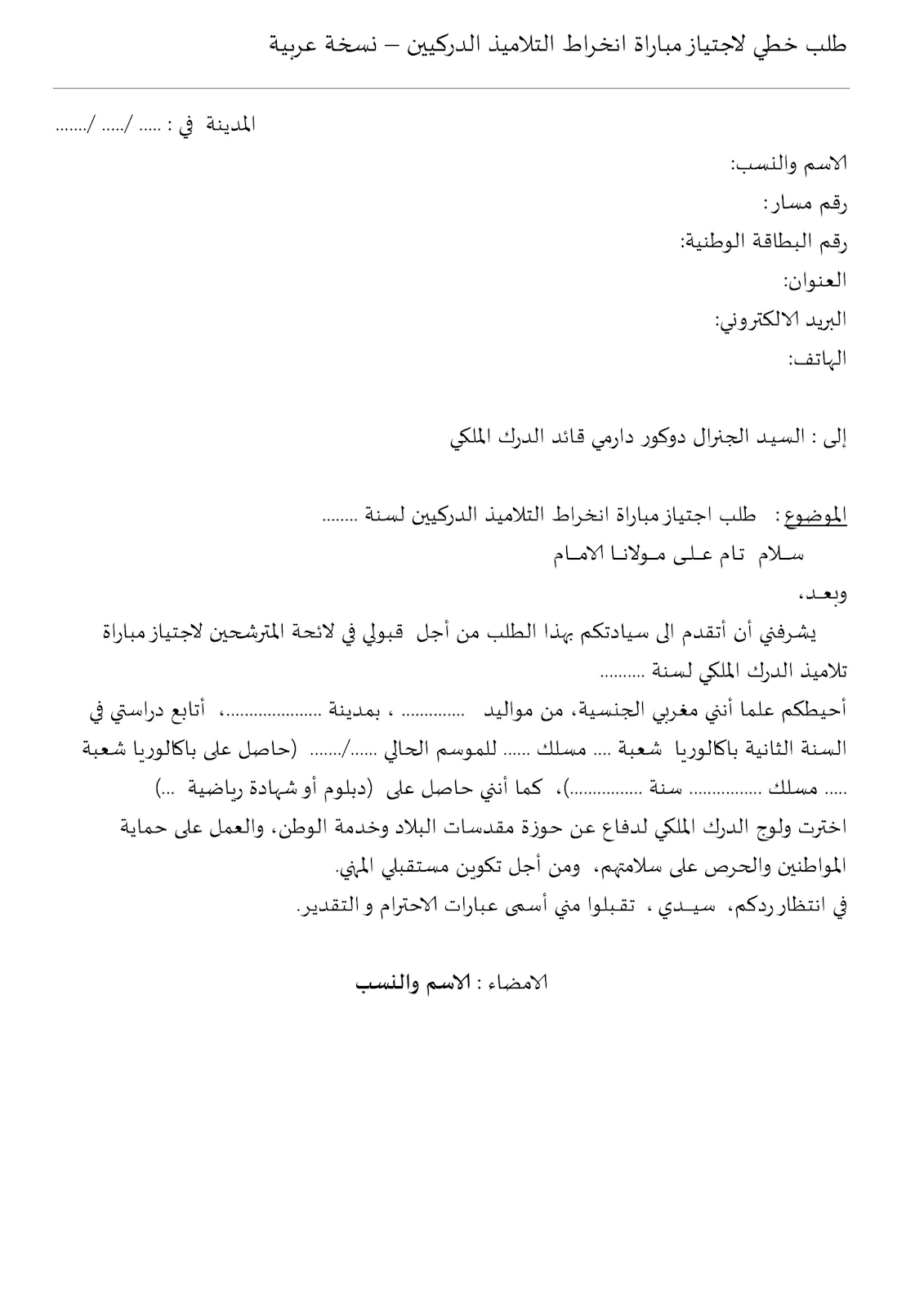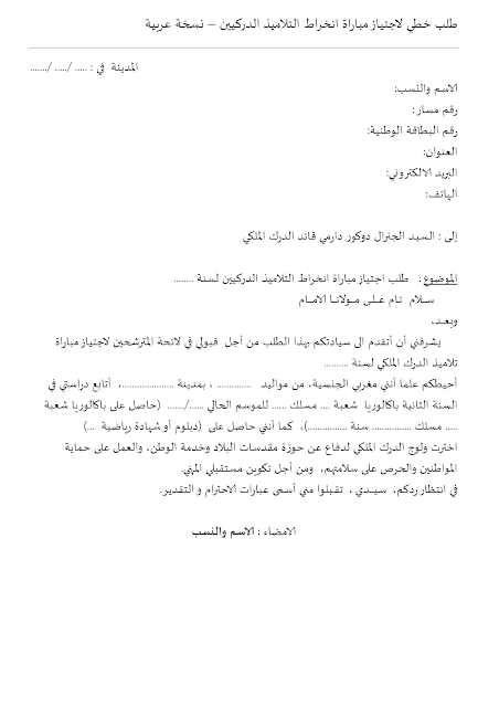 نمودج طلب خطي من اجل الإنخراط في مباراة الدرك الملكي للإطلاع عن اعلان مباراة مباراة ولوج سلك تلاميذ الدرك الملكي