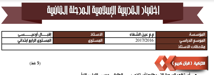 نموذج فرض المرحلة الثانية المستوى الرابع ابتدائي التربية الإسلامية وفق المنهاج المنقح